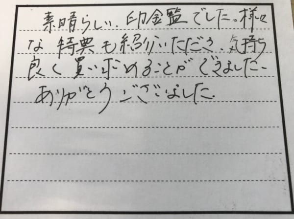 お客様の声 お客様の声 2018年06月30日 こちらこそありがとうございます。印鑑は人生の節目、節目において使用するご自分の分身の様な物です。ぜひ末永く大切にご愛用下さいませ。一心堂印房従業員一同、ご多幸を心よりお祈り申し上げます。 ◀︎お客様の声一覧へ