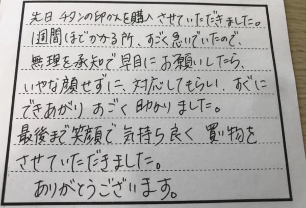 お客様の声 お客様の声 2018年10月31日 こちらこそ数多の印章店から当店でご購入下さいまして、ありがとうございました。 お客様のご要望にお応えすることが出来た事を大変嬉しく思っております。 本当にありがとうございました。 ◀︎お客様の声一覧へ