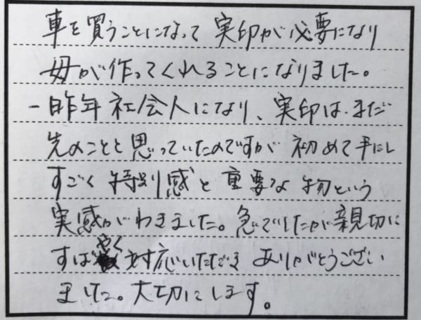 お客様の声 お客様の声 2019年03月01日 お車のご購入おめでとうございます。 実印は人生の節目、節目に使用するご自分の分身の様な物です。 お車同様、末永く大切にご愛用下さいませ。 ◀︎お客様の声一覧へ