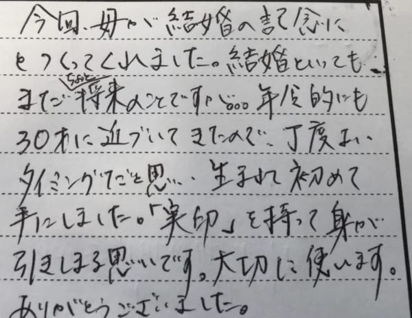 ありがとうございます。お母様から贈られたその実印には、これから将来へ向けての想い、愛情が込められていることでしょう。