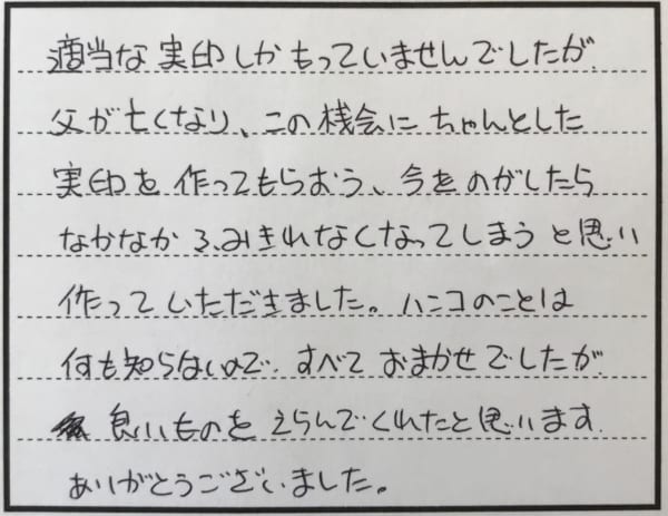 お客様の声 お客様の声 2020年03月27日 実印をご購入下さいまして、ありがとうございます。 実印は人生の大事な局面において必要なご自身の分身の様なものであります。 どうか末永く大切にご愛用くださいませ。 ◀︎お客様の声一覧へ